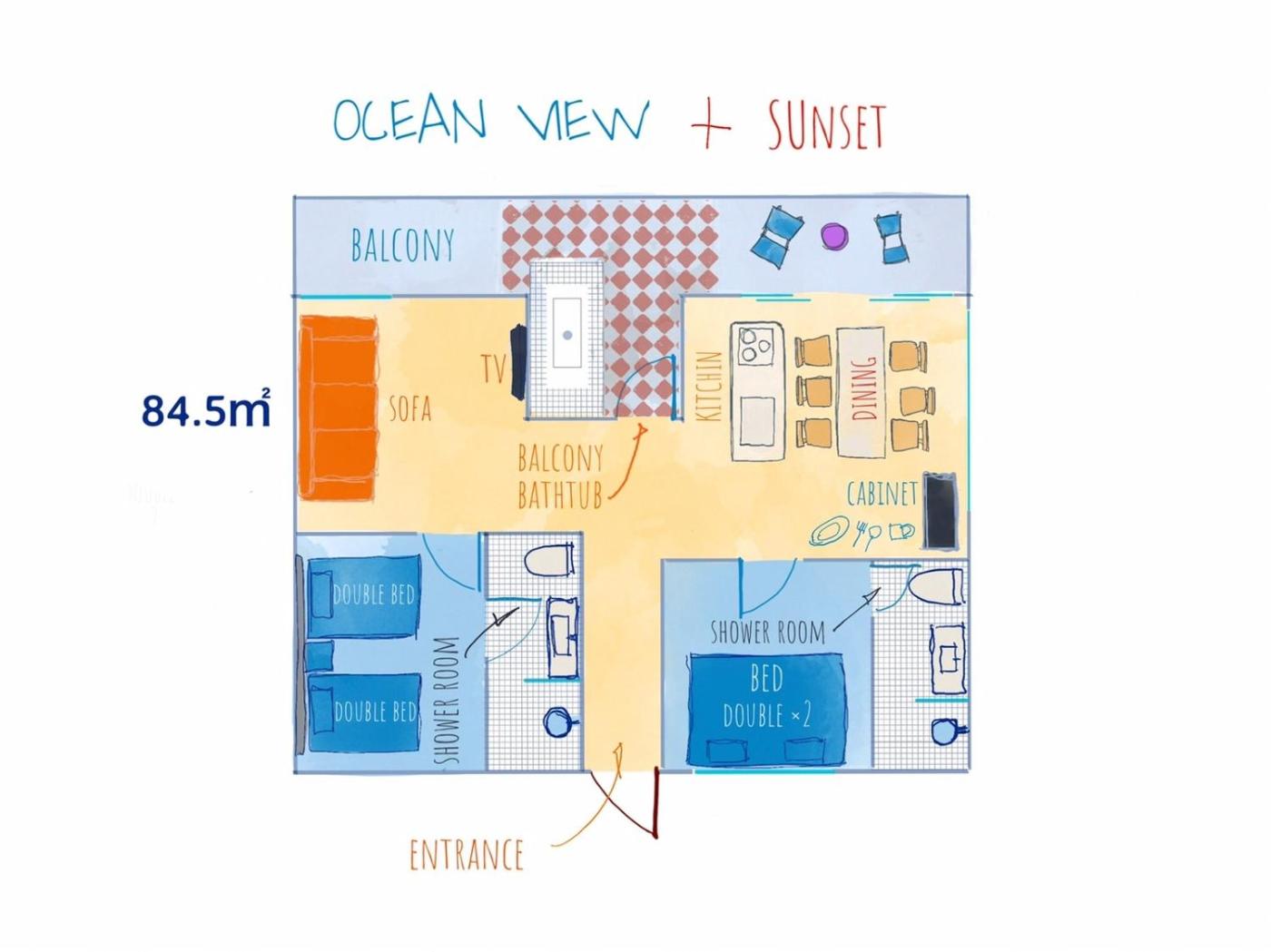 King Suite with Ocean View. This spacious suite includes 1 living room, 2 separate bedrooms and 2 bathrooms with a bath and free toiletries. In the well-fitted kitchen, guests will find a stovetop, a refrigerator, kitchenware and an oven. The air-conditioned suite offers a flat-screen TV with streaming services, a washing machine, a tea and coffee maker, a dining area as well as sea views. The unit has 4 beds. ;