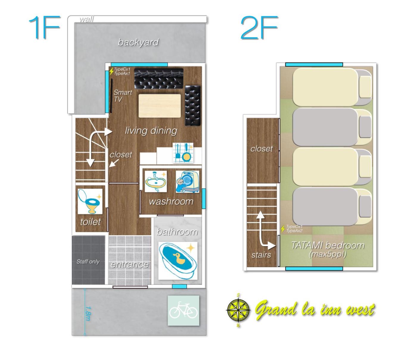 Family Room with Private Bathroom. The family room includes a private bathroom, well-fitted with a bath, a shower, a bidet, a hairdryer and slippers. In the fully equipped kitchenette, guests will find a refrigerator, a microwave, a toaster and an electric kettle. The air-conditioned family room provides a flat-screen TV with streaming services, a washing machine, tatami, a dining area as well as a quiet street view. The unit offers 5 futons.