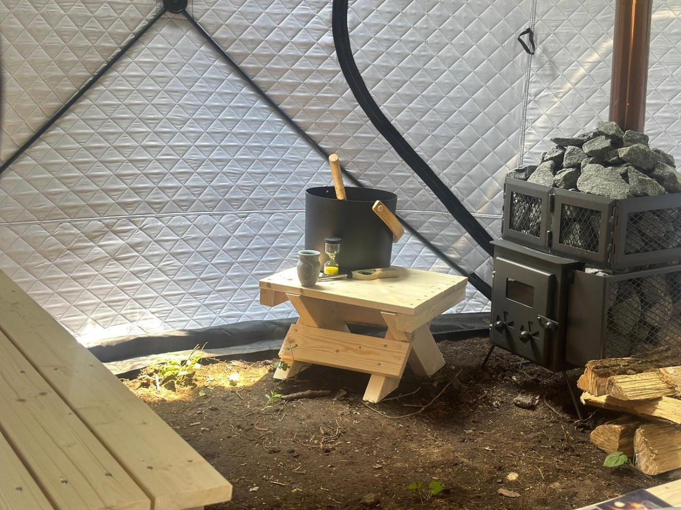 Tent. Guests will have a special experience as this tent features a sauna. The tent offers air conditioning, a barbecue, as well as a private bathroom featuring a shower and a hairdryer. In the kitchenette, guests will find a stovetop, a refrigerator, kitchenware and a microwave. The tent provides heating and outdoor furniture. The unit offers 3 beds.