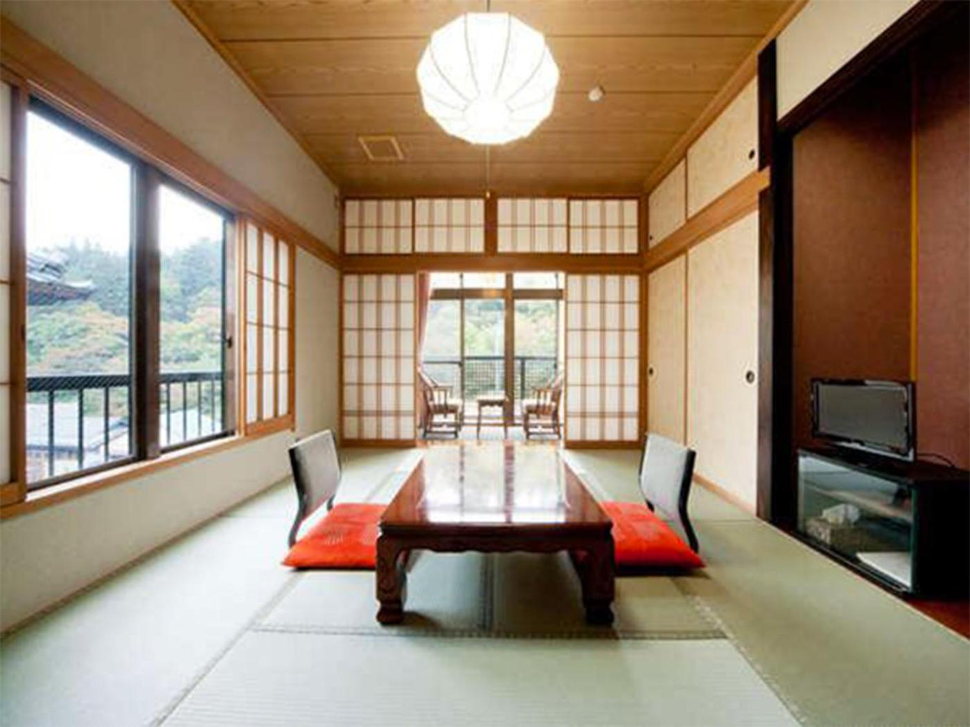 Japanese Style Room with Shared Bath Room. Offering free toiletries, this family room includes a shared bathroom with a hairdryer and slippers. The family room features tatami floors, a seating area with a flat-screen TV, air conditioning, an electric kettle as well as mountain views. The unit offers 4 futons. ;