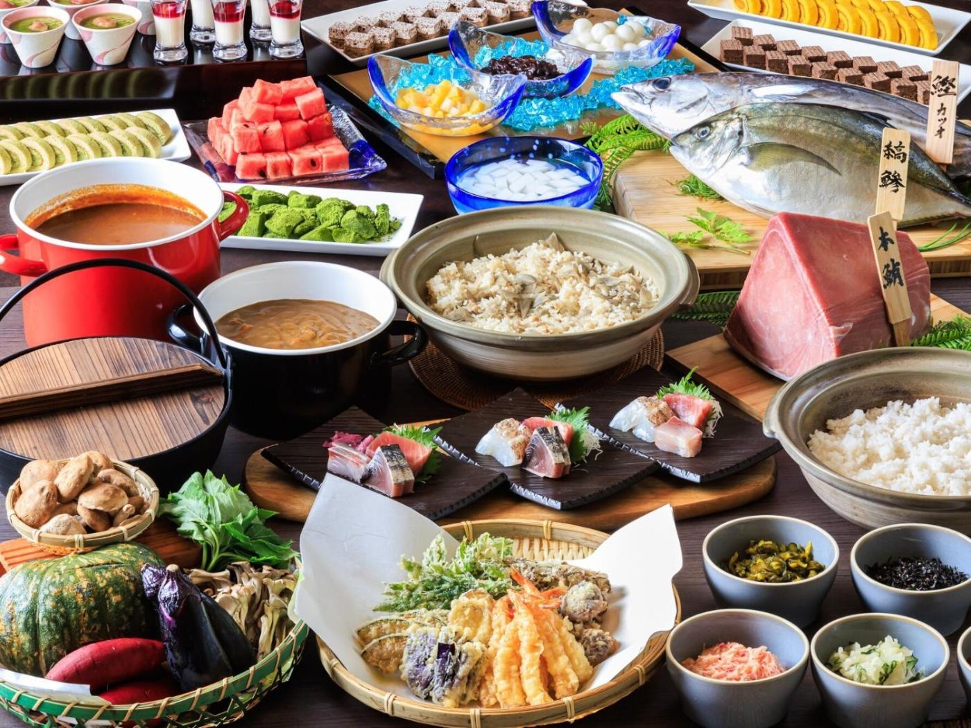 A selection of options including warm dishes, local specialities and fruits is served for the buffet breakfast. The ryokan is located in a geothermal area, with a number of hot springs nearby for guests to relax in.