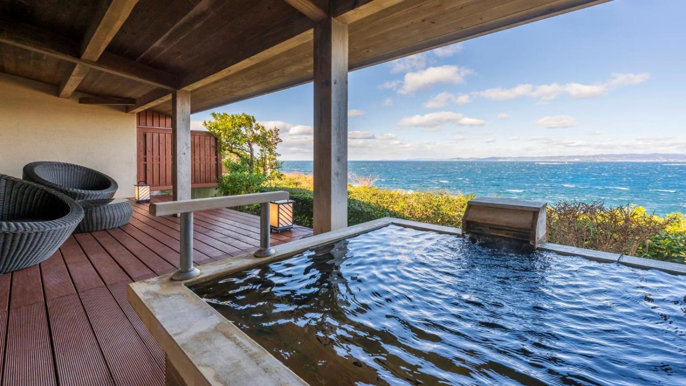 Deluxe Bungalow with Tatami area with Open-Air Hot Spring Bath and Ocean View. This twin room features a private open-air bath. The spacious twin room offers air conditioning, tatami, as well as a private bathroom boasting a shower and a bidet. The twin room features a safe deposit box, an electric kettle, pajamas, yukata, as well as a flat-screen TV. The unit has 2 beds and 1 futon. ;