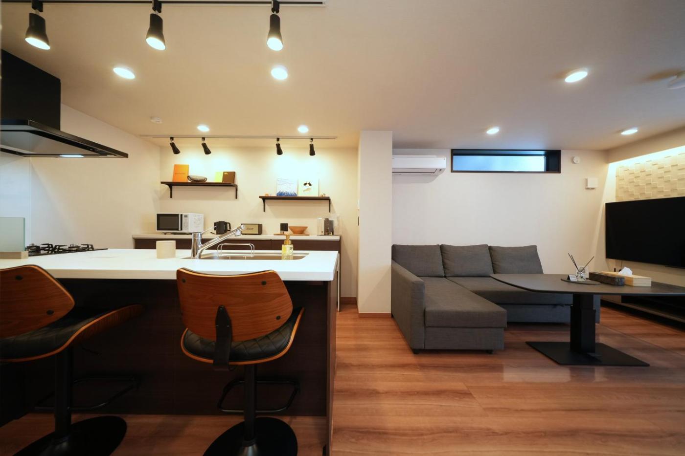 Two-Bedroom Villa. Boasting a private entrance, this air-conditioned villa comes with 1 living room, 2 separate bedrooms and 2 bathrooms with a shower and a bidet. Guests can make meals in the kitchen that features a stovetop, a refrigerator, a dishwasher and kitchenware. Featuring a terrace, this villa also features a washing machine, tatami and a flat-screen TV with streaming services. The unit has 3 beds and 2 futons.